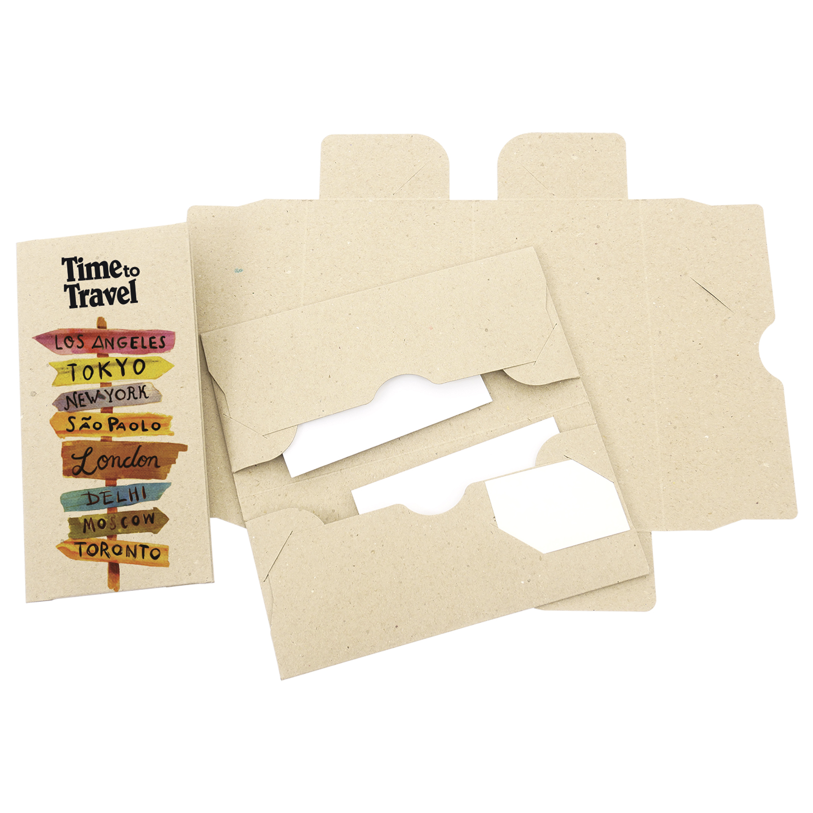 REF. 3054.C Funda de cartón reciclado con 2 bolsillos para billetes de avión y 1 tarjetero. Pieza automontable (se sirve en plano).